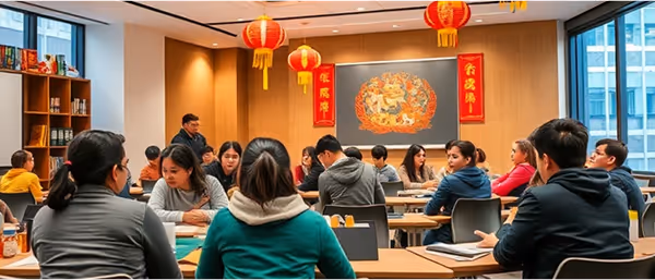 Sesión de estudio supervisada o práctica de conversación con compañeros chinos.