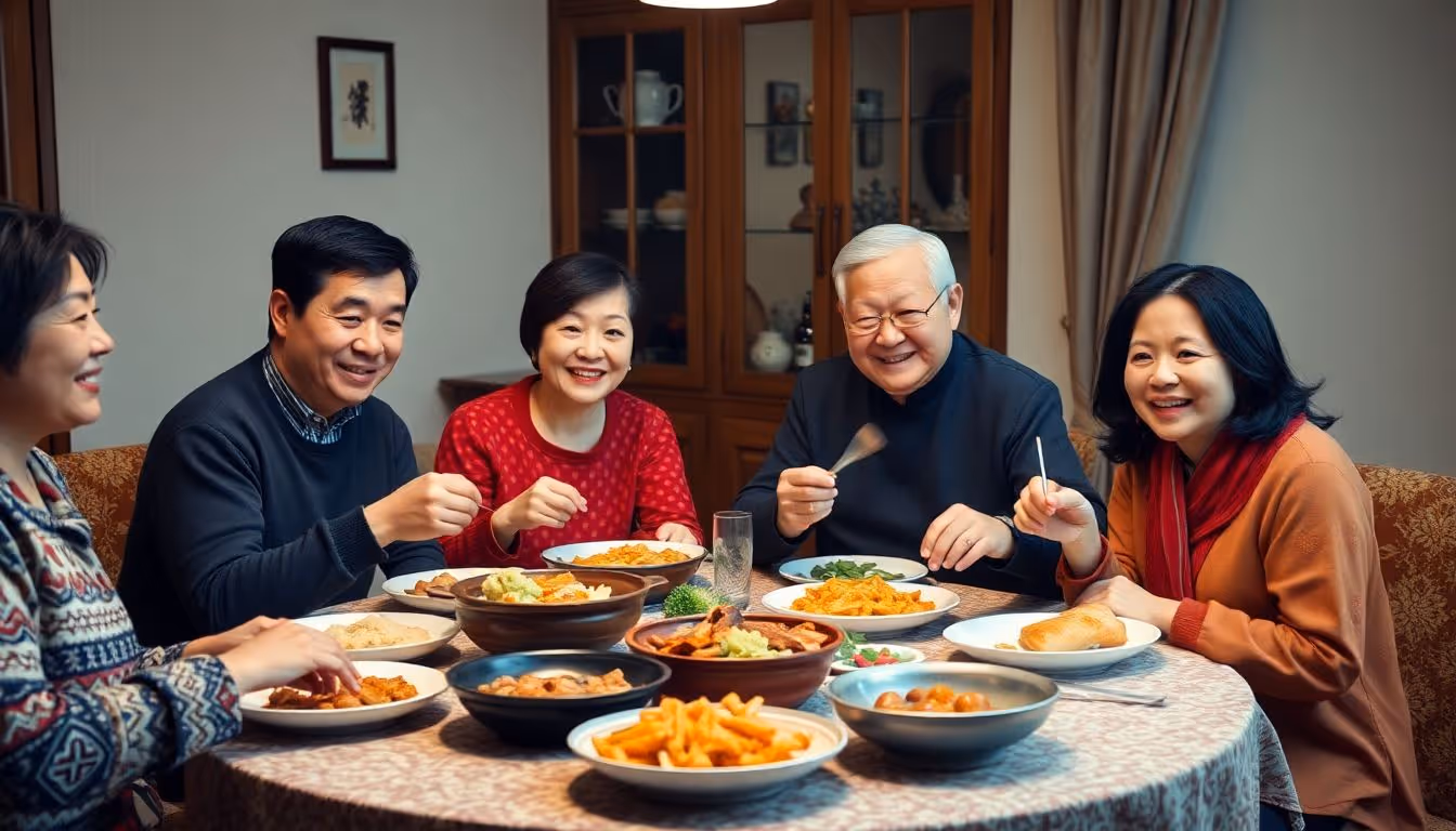 这张照片里有一家人在一起吃晚饭。我可以看到爷爷、奶奶、爸爸、妈妈和孩子们。桌子上有很多中国菜,比如鱼、饺子和蔬菜。他们看起来很开心,可能是在庆祝什么特别的日子。我觉得家人一起吃饭是很重要的传统,可以增进家人之间的感情。