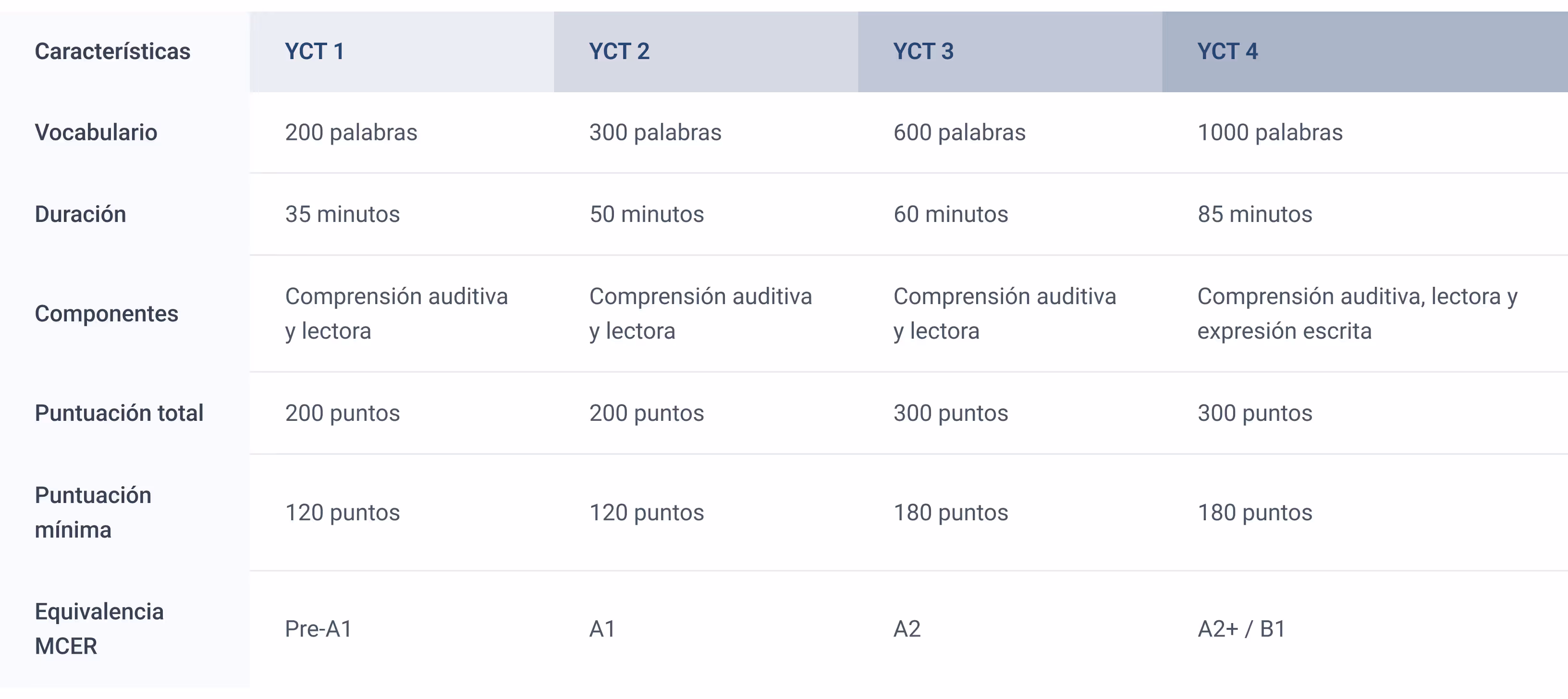 El YCT se divide en cuatro niveles progresivos, cada uno diseñado para evaluar diferentes competencias lingüísticas adaptadas a la edad y capacidad de los estudiantes.